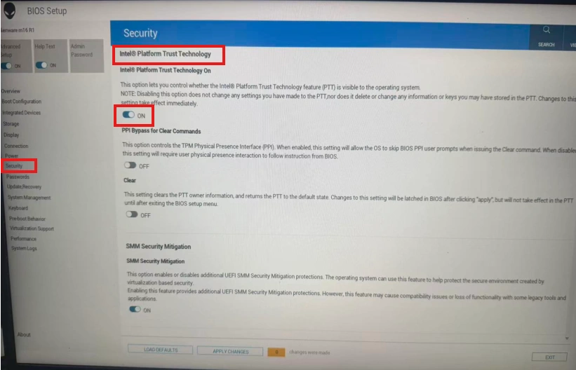 In the BIOS interface, select "Security". Navigate to "Intel Platform Trust Technology" and enable "Intel Platform Trust Technology On" by changing the setting from "OFF" to "ON".