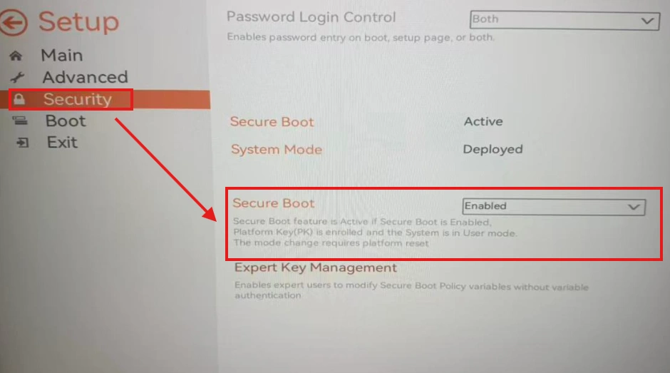 Step 3. Once inside the Setup interface, locate "Security," scroll down to find "Secure Boot," change the setting to "Enabled," and then save to complete the setup.