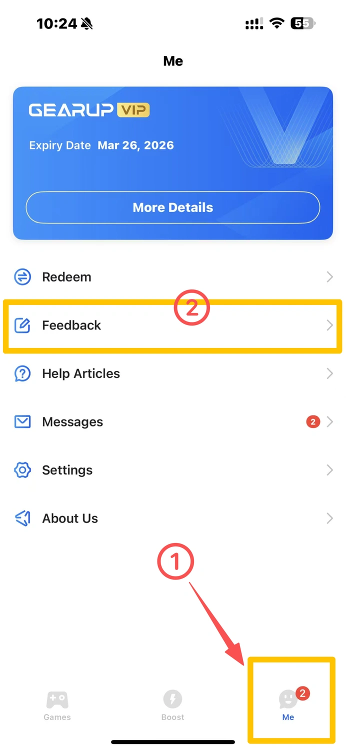 Apri GearUP - vai alla pagina 【ME】 - tocca 【Feedback】 per inviare i tuoi log.